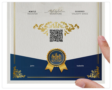 You’ll get your certificate with a registration number, your desire date and a QR code to visit your page’s title.