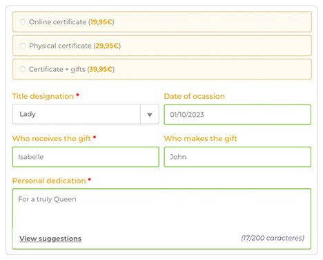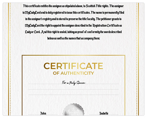 You’ll also receive the Certificate of Authenticity with the Scottish title’s rights with your custom dedication message.